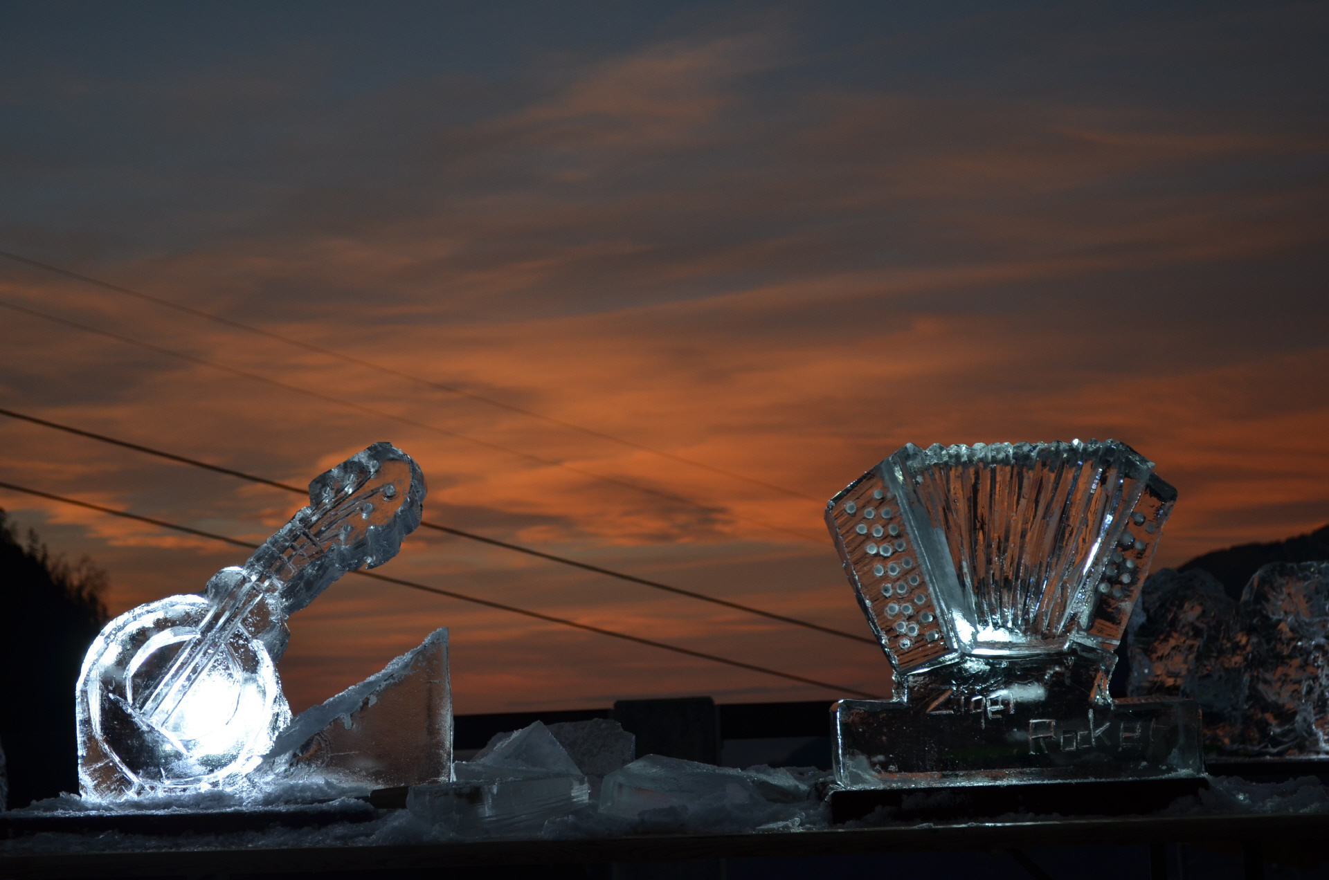 Eisblöcke, Schnitzwerkzeug, Handschuhe, Arbeitsplattformen mit Beleuchtung, Instruktor/en